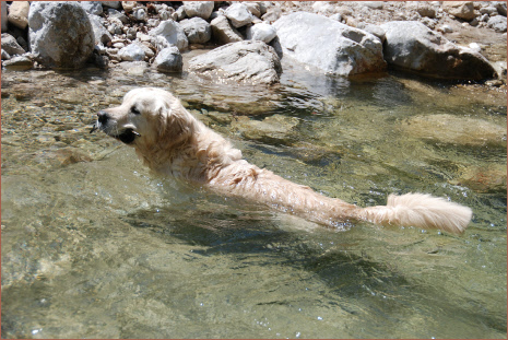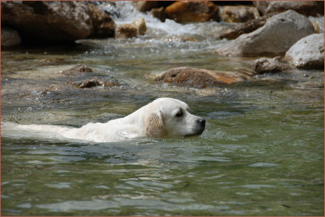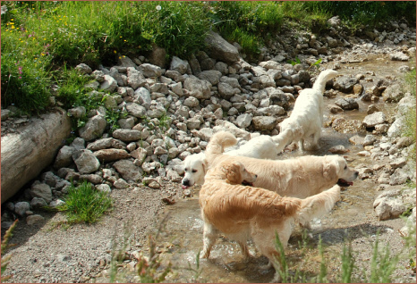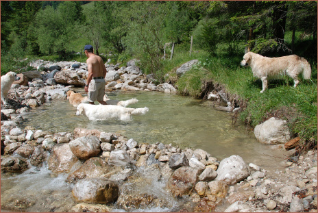 Die Stöffelalm ist Ausgangspunkt für viele schöne Wanderungen mit unseren Hunden. Sie genießen die Zeit in den Bergen ebenso wie wir. Am meisten Spaß macht es ihnen, im kalten Wasser rumzuplätschern und sich zu erfrischen. Dabei legt Maya sich gerne ins Wasser und beobachtet vom Rand aus, das Geschehen.
