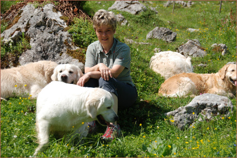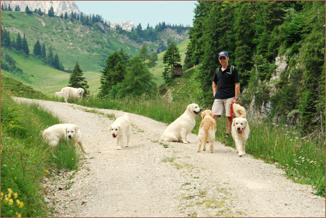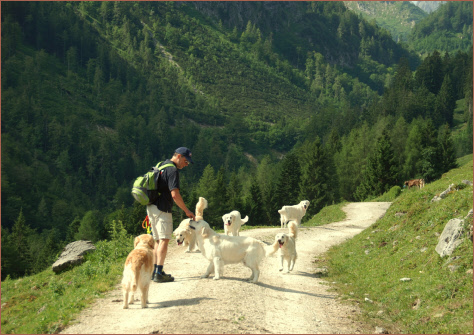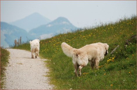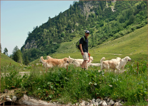 Wir kennen uns hier schon gut aus. Überall geht es natürlich nicht. Manchmal müssen sie dicht bei uns bleiben oder auch mal zur Sicherheit angeleint werden, wenn der Hang am Wanderweg zu steil ist.
