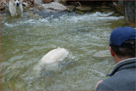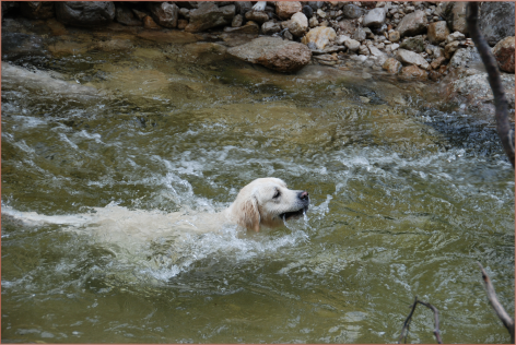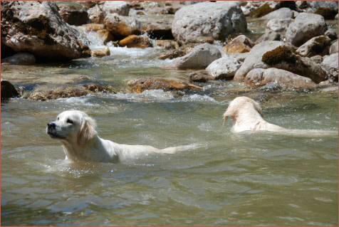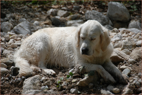 Der Knaller ist Elliott, er ist unter die Taucher gegangen. Uns wird manchmal Himmel, Angst und Bange, wenn er so lange unter Wasser bleibt. Unermüdlich rührt er im Wildbach rum. Polly und Lilly sind längst müde und wärmen sich in der Sonne ein wenig auf.