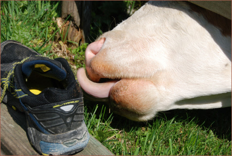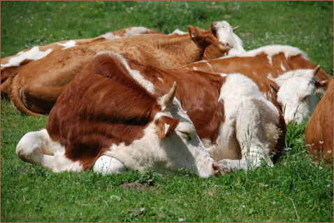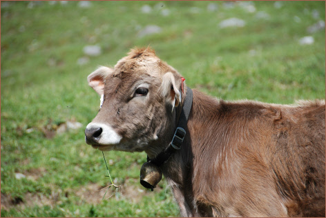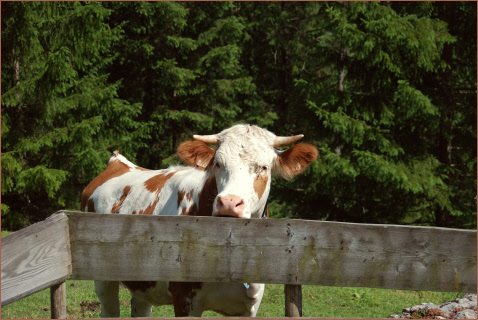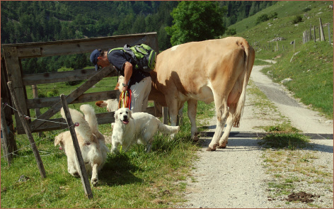 Ja, und was wäre eine Alm ohne Kühe. Einige schauen neugierig über den Zaun. Als wollten sie fragen: „Hey Eddie, was machst du denn da?“ Andere halten Mittagschlaf oder genießen es auch mal von uns gebürstet zu werden.