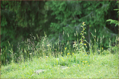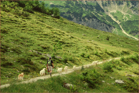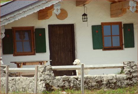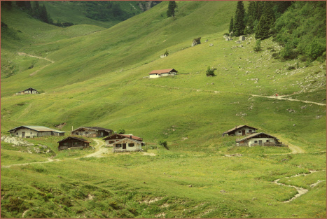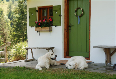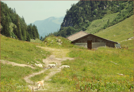 Unsere Hunde werden plötzlich wieder schneller. Neugierig laufen sie zu den Hütten. Nanu, ist hier niemand daheim? Wo sind die Hirten und Senner mit ihrem Fleckvieh? Alles sieht verlassen aus. Ach ja, sie sind alle noch auf der Niederalm. Erst wenn dort die Wiesen abgefressen sind, werden die Kühe auf die Hochalm getrieben.