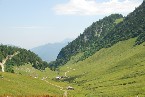 Wir folgen dann einem schmalen Almenweg. Dieser Wegabschnitt bietet einen schönen Ausblick ins Tal. Bei einer kleinen Rast halten wir für einen Moment inne und lassen alle die Seele baumeln.