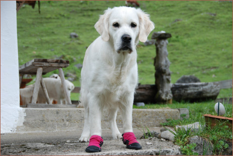 Polly hat noch zwei Tage freiwillig ihre „Füße“ stillgehalten. Danach lief sie vorerst nur auf der weichen Wiese, um ihre Pfoten zu schonen. Unsere Ausflüge waren derweil nur kurz. Schon nach einer Woche flitzte sie wie immer rum. Gott sei Dank! Ende gut, alles gut.