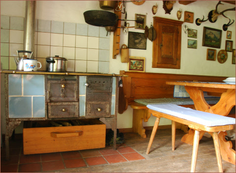Auch sonst wird auf dem Holzofen gekocht. Leckere Pfannengerichte, die nach einer Wanderung ganz besonders gut schmecken und schnell gemacht sind, wie Spätzle mit Gulasch, Tiroler Gröstl oder auch Kaiserschmarrn.