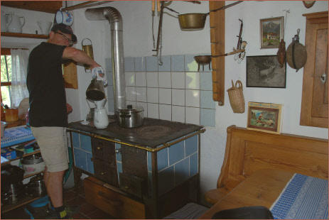 In der Hütte knistert schon das Feuer im Ofen. Wir kochen uns derweil einen Pott Kaffee und genießen die Ruhe und die herrliche Bergluft.