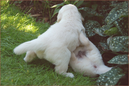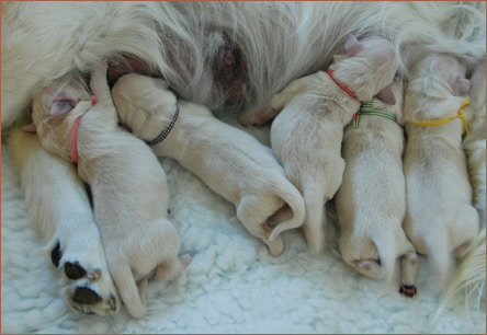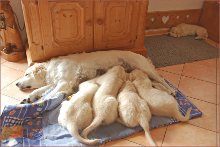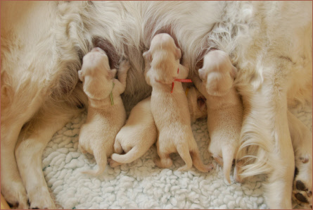 Während des Säugens üben sie mit den Vorderpfoten den sogenannten Milchtritt aus, der die Milchproduktion stimuliert. Läuft die Milchabsonderung für die Welpen zufriedenstellend, wackeln diese während des Saugens mit dem Schwänzlein.