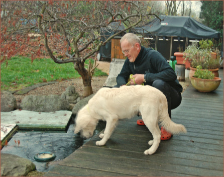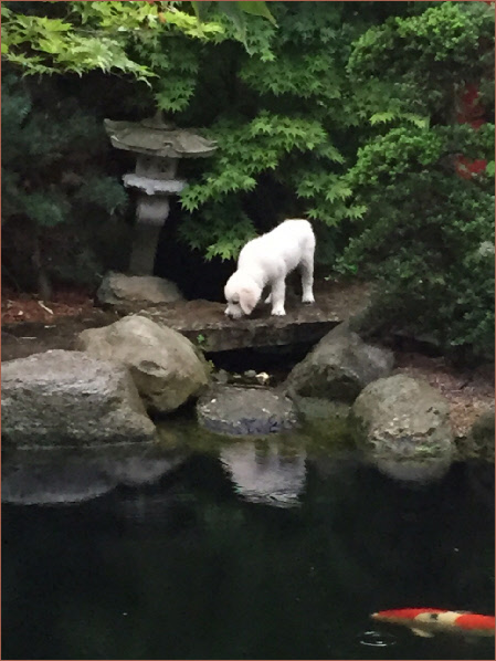 Umba muß sich nicht nur an sein neues „Rudel“ gewöhnen, auch die örtlichen Gegebenheiten in seinem neuen Zuhause sind ganz anders. Auf dem Foto sieht man Olaf mit Umba, als sie gerade den Garten erkunden. Zum Garten gehört auch ein großer Teich, dessen Besitzansprüche allerdings ganz klar bei den Urbewohnern, den Kois, liegen. Damit Umba sich die großen Fische mal aus der Nähe betrachten konnte, hat Olaf sie angefüttert. Neugierig schaut er eine Weile dem Spektakel zu. Hoffentlich empfindet Umba genauso wie ich, dass der Anblick der riesigen Kois recht respekteinflößend ist. Denn das ist kein Badeteich.