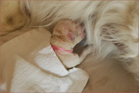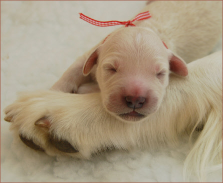 Der sechste Welpe, eine kleine Hündin, kam leider mit geöffneter Fruchthülle auf die Welt und war tot. Die Geburt dauerte etwas länger als bei ihren Geschwistern. Sie wog auch nur 220g. Ich vermute, dass sie nicht im Geburtskanal erstickte, sondern, dass sie zum Zeitpunkt der Geburt bereits tot war. Ich beobachtete nämlich folgendes: Ein paar Tage vor der Geburt vernahm ich einen kurzen, aber sehr lauten, verzweifelten Schrei von Maya, welcher mir durch Mark und Bein ging. Im Anschluß lief sie im Wohnzimmer aufgeregt hin und her und verkroch sich letztendlich unter die Bank. Maya spürte anscheinend, dass etwas in ihr vorging und zwar, dass ein Welpe abstarb. Was da genau passierte, wissen wir nicht. Die Natur hat es so gewollt. Trotzdem stimmt es uns traurig.