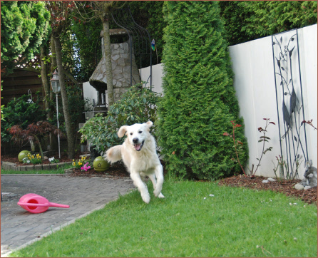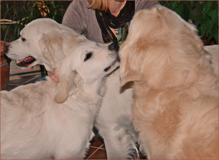 Wie verabredet klingeln wir kurz nach drei bei Heike, Olaf und Chloe. Zuerst sehen wir Heike an der Tür. Nur einen Moment später läuft Chloe schon an ihr vorbei und begrüßt uns stürmisch am Gartentor. Sie ist ganz aus dem Häuschen. Voller Freude läßt sie sich von uns den Hals kraulen. Welch eine Aufregung! Nach der Begrüßung bitten uns Heike und Olaf herein. Aber wir haben ja noch eine Überraschung parat. Schnell holen wir Chloe´s Eltern aus dem Auto. Als Chloe, Maya und Eddie sich dann sahen, war die Wiedersehensfreude natürlich überschwenglich. Sie sprangen aneinander hoch und in hohen Tönen bellte Chloe immer wieder, als wollte sie sagen: „Schön, das ihr mich besuchen kommt!“
