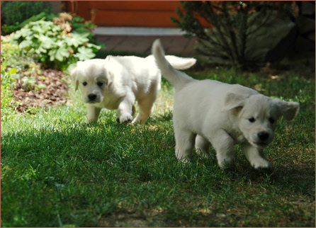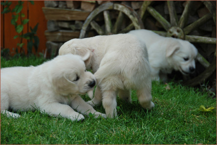 Heute Nachmittag ertönte ein lustiges Gequieke in der Welpenkiste. Neugierig schaute ich rein und sah wie der kleine Grüne fröhlich auf allen vier Beinchen tippelte. Er freute sich so sehr darüber, dass er gleich allen und jedem sein Glück mitteilen mußte. Das Ganze ähnelte zwar einem Balanceakt auf dem Seil, aber immerhin schaffte er es von der einen zur anderen Seite. Alle anderen eifern ihm fleißig nach, nach dem Motto: Was du kannst, können wir auch. Allerdings schleifen ihre Bäuchlein noch etwas auf dem Boden und nach ein paar wackeligen Schritten fallen sie wieder um. Ansonsten heißt es: Trinken, Schlafen, Kuscheln und Wachsen.