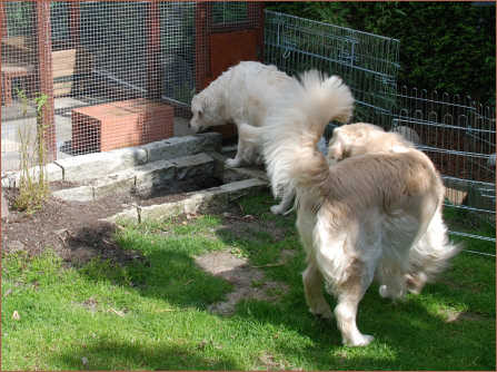 Danach holen wir Maya und Eddie aus dem Auto. Für mich ist das immer der schönste Augenblick, wenn sich Eltern und Kinder nach langer Zeit wieder einmal begegnen. Am Anfang treten sie ihren Eltern mit Respekt entgegen. An ihrem Gesichtsausdruck merke ich kurz darauf, dass etwas in ihnen vorgeht. Am Geruch erkennen sie nämlich ihre Eltern noch nach vielen Jahren wieder. In nullkommanichts ist dann der Bann gebrochen. So war es heute auch bei Charlie. Er flitzte sofort übermütig umher und gab deutlich zu verstehen: „Toll, dass ihr gekommen seid!“