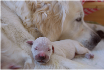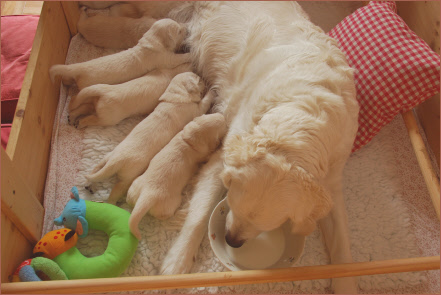 Der Mama geht es auch gut und dem Papa sowieso. Maya ist rund um die Uhr im Einsatz mit säugen (ca. alle 2 Stunden), Bäuchlein massieren und putzen. Das ist für sie sehr kräftezehrend. Deshalb ist Maya´s Ernährung auch äußerst wichtig. Alles was sie frißt, geht in die Muttermilch und ist der Grundstein für eine gute Gesundheit ihrer Welpen.