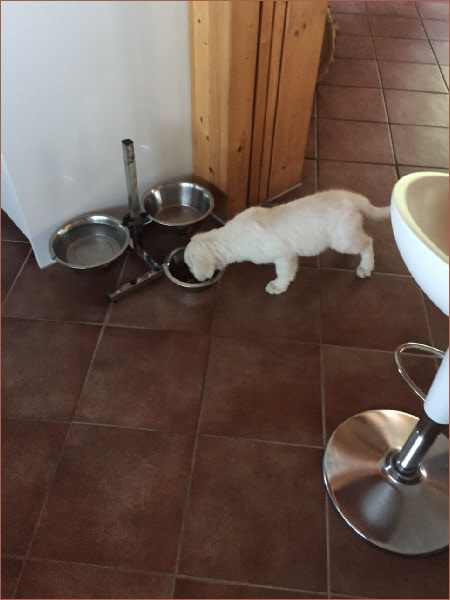 Gestern Abend hat Papa Eddie schon mal für einen kleinen Moment am „Wochenbett“ gestanden, um seinen Kindern „Hallo“ zu sagen. Er konnte sein Glück kaum fassen und winselte vor Freude.