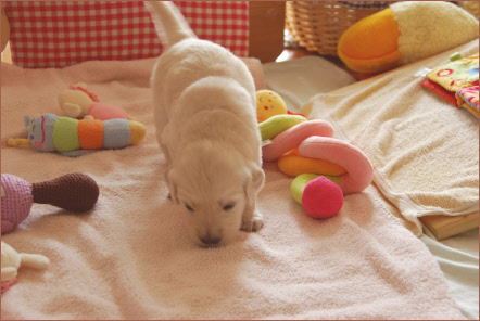 Wenn ich derzeit die Welpenstube betrete, achte ich zu aller erst auf die Welpen, ob sie eventuell ihre Köpfchen schon heben. Denn dies könnte ein erstes Zeichen dafür sein, dass sie beginnen zu Hören. Aber dem war bisher noch nicht so. Lange kann es allerdings nicht mehr dauern.