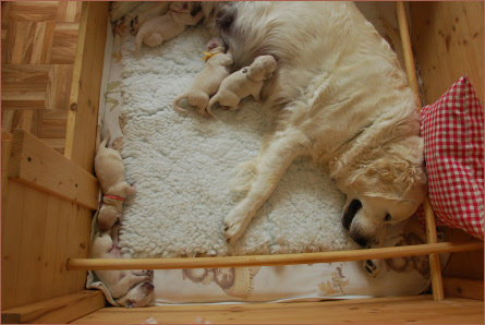 Eine weitere Besonderheit in dieser Zeit ist noch, dass Maya regelmäßig die kleinen Bäuchlein ihrer Kinder mit der Zunge massiert. Zum einen wird damit die Verdauung angeregt und zum anderen werden sie stimuliert, ihre Ausscheidungen abzusetzen. Denn von alleine klappt es noch nicht. Maya weiß immer ganz genau, welcher Welpe als nächstes drankommt.