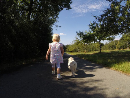 Völlig entspannt und locker liefen Linni und Charlie´s Mama an der Hundeleine ein Stück den Spazierweg entlang. Manch einer wird sich jetzt fragen, warum die Leinenführigkeit bei diesem ungewöhnlichen Gespann auf Anhieb so gut klappt. Das ist so zu erklären. Kinder sind noch unverfälscht. Sie tragen keine Masken wie viele erwachsene Menschen und führen auch keinen Monolog mit vielen Ausrufezeichen sondern einen Dialog. Sie stehen auf eine Ebene mit dem Hund, auf ich und du. Sie gehen ganz einfach nur zusammen spazieren.