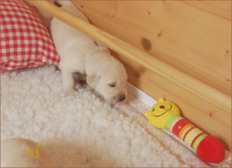 Zaghafte Laufversuche werden unternommen. Anfangs können sie ihr Gleichgewicht noch nicht halten und fallen nach 2-3 Schritten wieder um. Wenn aber erstmal die Muskeln der Beine kräftiger geworden sind, dann erkunden sie neugierig, tapsend ihre Wurfkiste. Schnüffeln am Boden oder knabbern an ihren Geschwistern. Die Stimmen werden immer lauter. Ab und zu ist schon ein Bellen oder Knurren heraus zu hören. Sie fangen an, Urin und Kot selbständig abzusetzen.