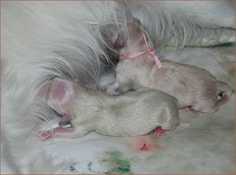 Nach der Geburt des Welpen befreit die Hündin ihn von der noch vorhandenen Fruchthülle, leckt ihn trocken und beißt die Nabelschnur durch. Die auf den Welpen befindliche Amnionflüssigkeit löst bei der Hündin Brutpflegeverhalten aus, deshalb ist es wichtig, die Hündin selber ihre Welpen aus der "Eihaut" auspacken zu lassen. Der Winzling schreit und will sich auf den Weg zur Zitze machen, aber er darf erst losrobben, wenn er geputzt ist. Die Erstmilch oder auch Kolostralmilch genannt, welche die Mutterhündin gleich nach der Geburt produziert, ist lebenswichtig für die Welpen. In dieser Milch sind alle wichtigen Nährstoffe enthalten, die sie gegen Infektionskrankheiten schützen. So sind sie in den ersten Wochen vor Krankheiten gesichert, gegen die sie erst mit der 8. /9. Woche geimpft werden.