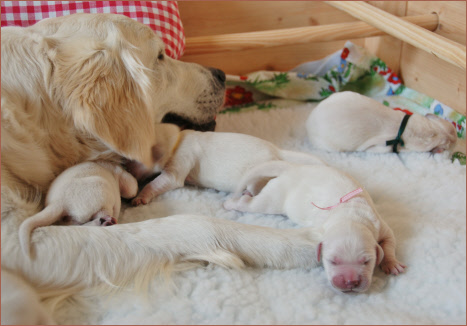 Urinieren und Koten können sie nur, wenn die Mutter ihre Bäuche leckt. Daher ist die Nähe, Wärme und Geborgenheit der Hündin zu diesem Zeitpunkt das Wichtigste. Die Mutter verlässt in den ersten Tagen auch nur sehr ungern die Wurfkiste, höchstens mal schnell um ihr „Geschäft“ zu machen.